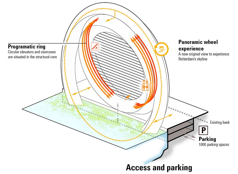 With collaboration of the Dutch designers from the EWICON, Rotterdam is going to build a Dutch Windwheel nearby the popular Erasmus bridge. It must become a sustainable icon of the future. The Dutch Windwheel has in the centre an EWICON system, which turns damp from the wind into electricity. In the ring apartments, hotels, restaurants will be built-in. Also there will be a sightseeing panoramic wheel function, to look out over Rotterdam city or under water in the river. In the ring aren’t only tourism attractions, but the building has also sustainable functions beside EWICON: