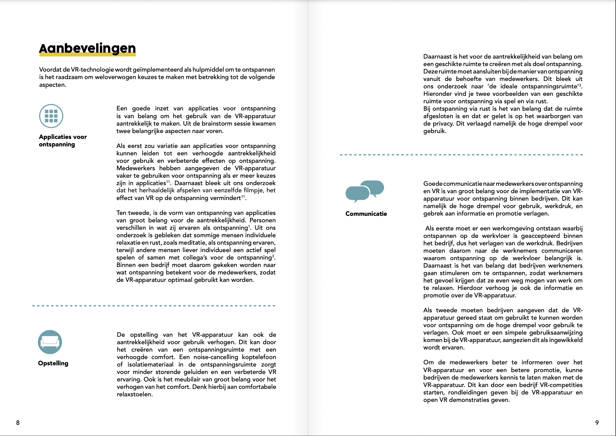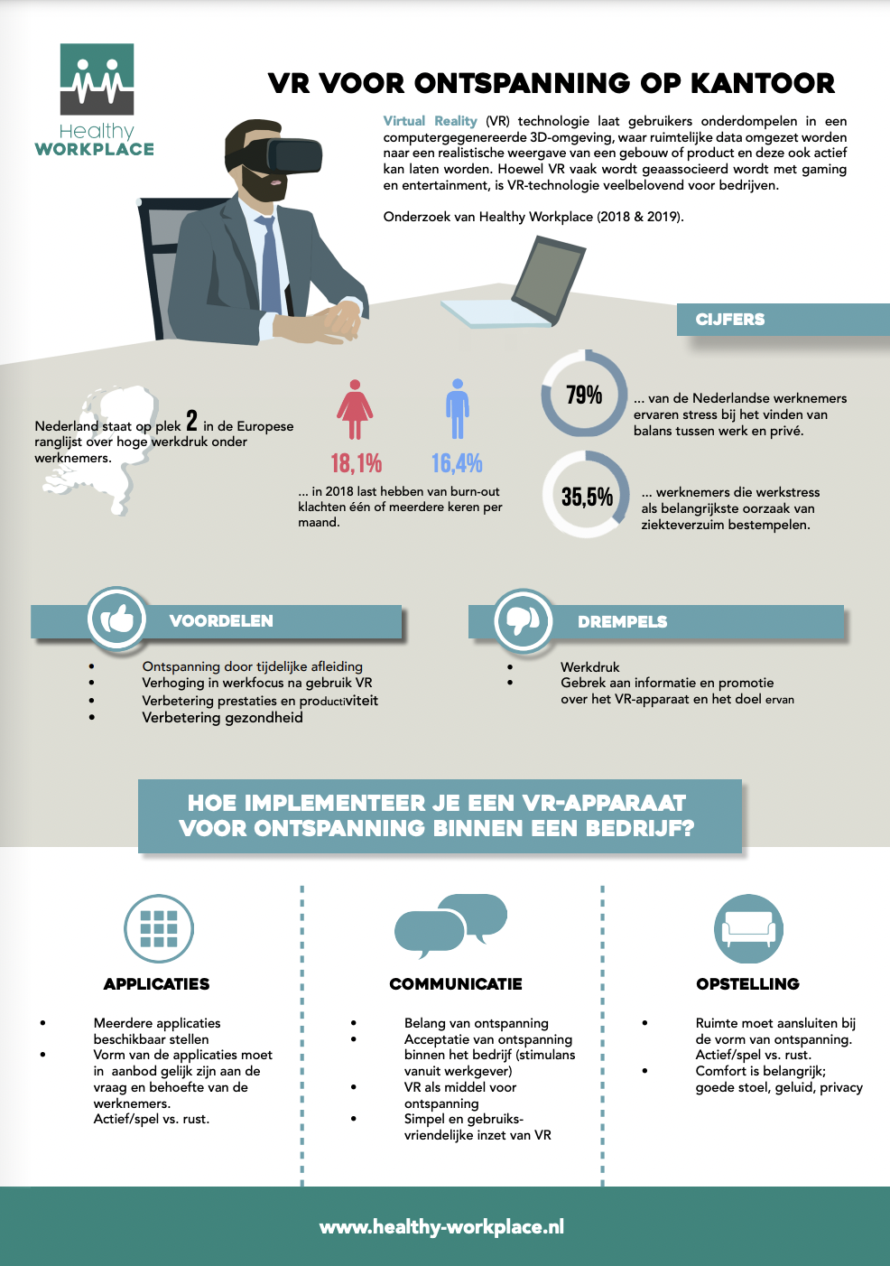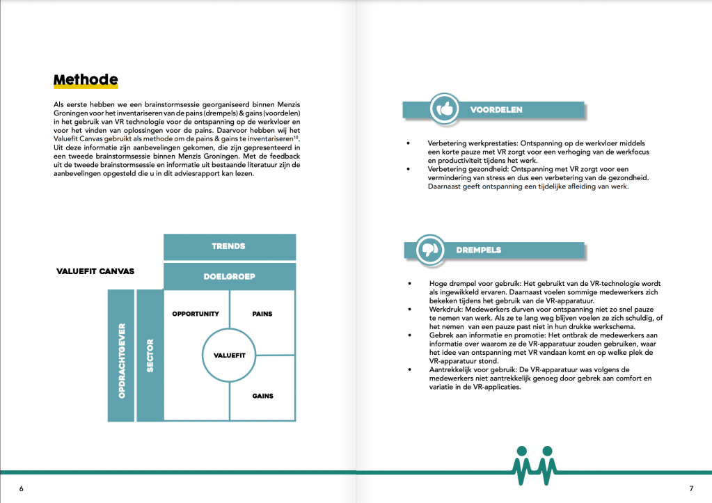 In opdracht van SAMEEN heb ik met Eva Postuma voor Healthy Workplace i.s.m. Menzis Groningen een onderzoek gedaan naar de Virtual Reality (VR) technologie in de praktijkomgeving, zie whitepaper. Een VR technologie laat gebruikers met een 360 graden 3D-bril en koptelefoon onderdompelen in een andere omgeving.