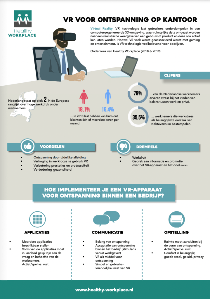 Hoewel VR vaak wordt geassocieerd met gaming en entertainment, is VR-technologie veelbelovend voor bedrijven, gezien de laatste cijfers over werkdruk, burn-out klachten en werkstress. Wat kan een VR-installatie betekenen voor de ontspanning op de werkvloer?