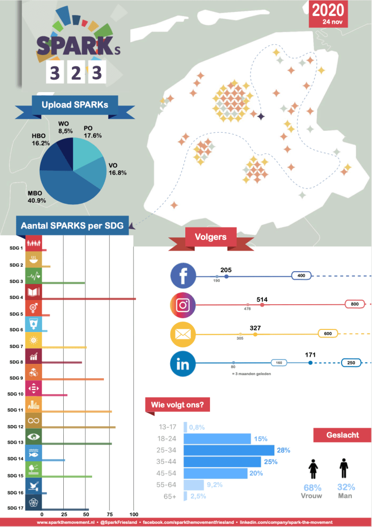 Voor SPARK the Movement is onderstaande factsheet gemaakt om te communiceren op social media met de volgers hoe SPARK the Movement het doet als regio qua duurzame activiteiten van onderwijsinstellingen, en qua betrokkenheid/groei van de volgers.