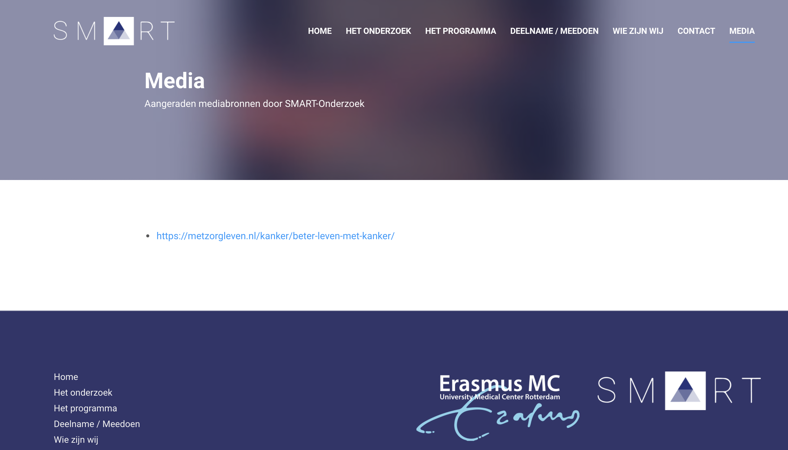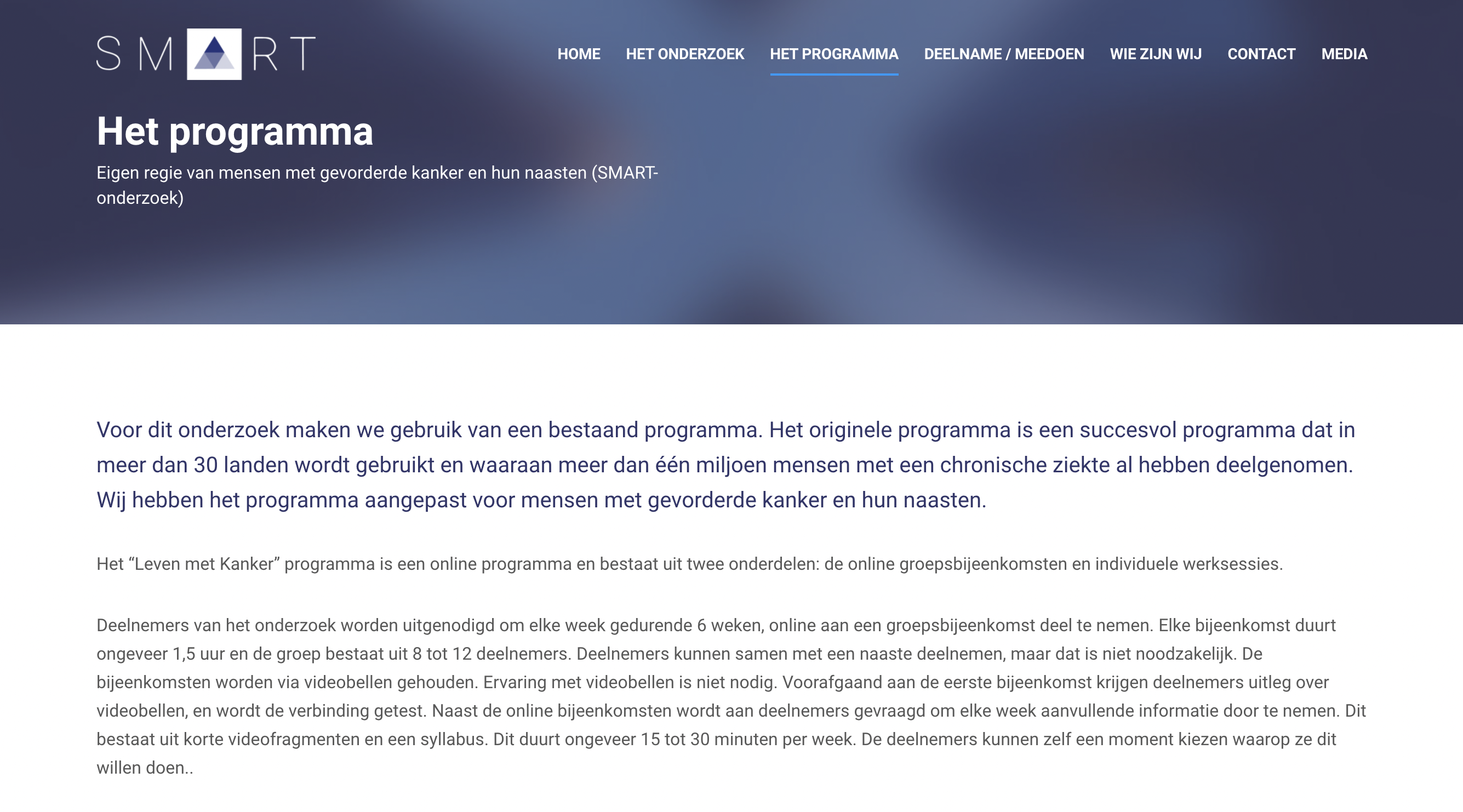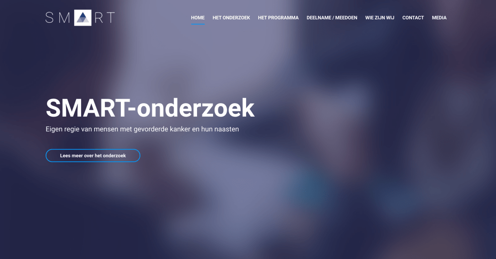 Hoofdonderzoekster Drs. Nancy Luu van het Erasmus MC verzocht mij en OKayan om een website te maken voor SMART-onderzoek, een onderzoek uitgevoerd met mede-onderzoekers naar mensen van gevorderde kanker en hun naasten in het hebben van een eigen regie in het ziekteproces.